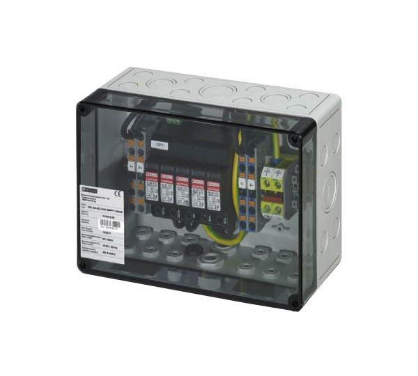 Cutie combinatoare de siruri pentru sisteme fotovoltaice de pana la 1000 V DC pentru conectarea a 2x 2 siruri. Cu protecție la supratensiune (tip 1/2) și conexiune Push-in pentru intrare și ieșire.